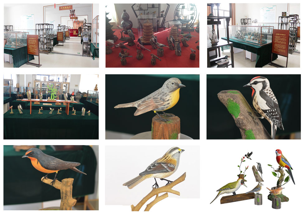選送作品《百鳥(niǎo)朝鳳》采用泰州傳統(tǒng)的彩繪木雕工藝。通過(guò)在木雕上繪上各種顏色,讓鳥(niǎo)幾可亂真。由于鳥(niǎo)的羽毛紋理采用了微雕工藝,摸上去的手感也和真的羽毛模一樣,配上相宜的樹(shù)樁底座或蘆葦葉,色彩艷麗。層次豐富,惟妙惟肖、淋漓盡致,達(dá)到了“精而不繁”“靜中含動(dòng)”的效果。